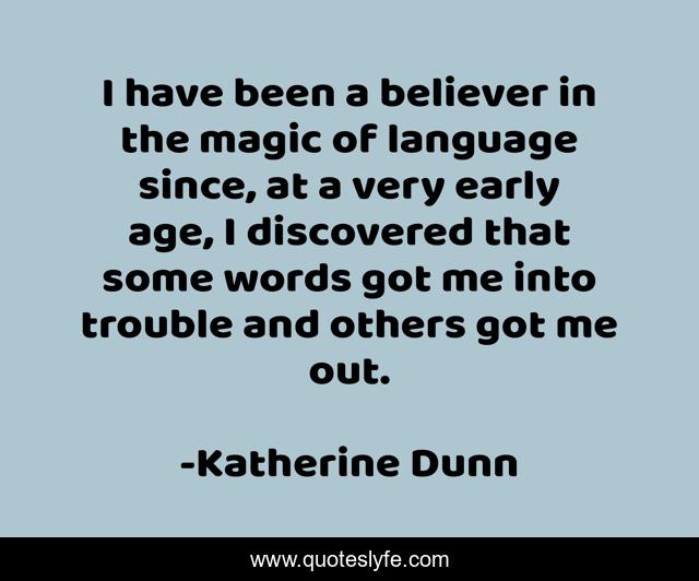 This page presents the quote "I have been a believer in the magic of language since, at a very early age, I discovered that some words got me into trouble and others got me out.". Author of this quote is Katherine Dunn. .
