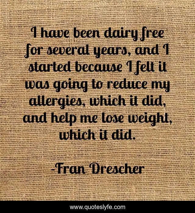 This page presents the quote "I have been dairy free for several years, and I started because I felt it was going to reduce my allergies, which it did, and help me lose weight, which it did.". Author of this quote is Fran Drescher. This quote is about me, help, free,.