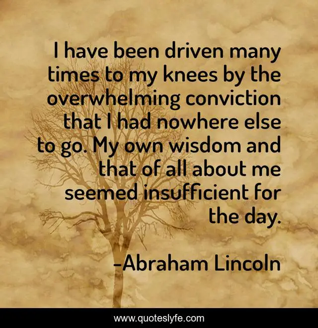 This page presents the quote "I have been driven many times to my knees by the overwhelming conviction that I had nowhere else to go. My own wisdom and that of all about me seemed insufficient for the day.". Author of this quote is Abraham Lincoln. .