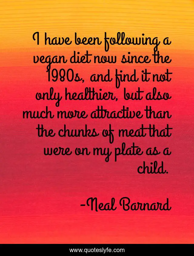 This page presents the quote "I have been following a vegan diet now since the 1980s, and find it not only healthier, but also much more attractive than the chunks of meat that were on my plate as a child.". Author of this quote is Neal Barnard. This quote is about child, find, meat,.