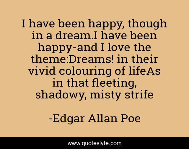 This page presents the quote "I have been happy, though in a dream.I have been happy-and I love the theme:Dreams! in their vivid colouring of lifeAs in that fleeting, shadowy, misty strife". Author of this quote is Edgar Allan Poe. This quote is about edgar-allan-poe, poetry, dreams,.
