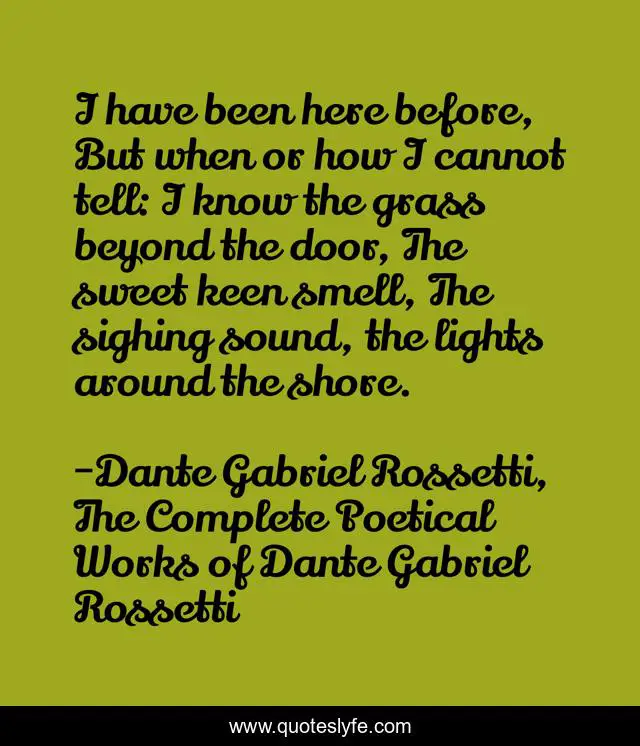 This page presents the quote "I have been here before, But when or how I cannot tell: I know the grass beyond the door, The sweet keen smell, The sighing sound, the lights around the shore.". Author of this quote is Dante Gabriel Rossetti, The Complete Poetical Works of Dante Gabriel Rossetti. .