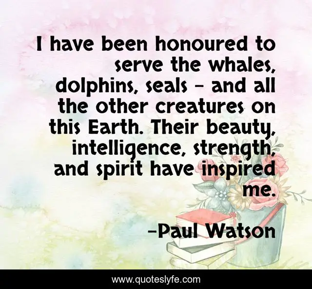 This page presents the quote "I have been honoured to serve the whales, dolphins, seals - and all the other creatures on this Earth. Their beauty, intelligence, strength, and spirit have inspired me.". Author of this quote is Paul Watson. This quote is about me, intelligence, beauty,.