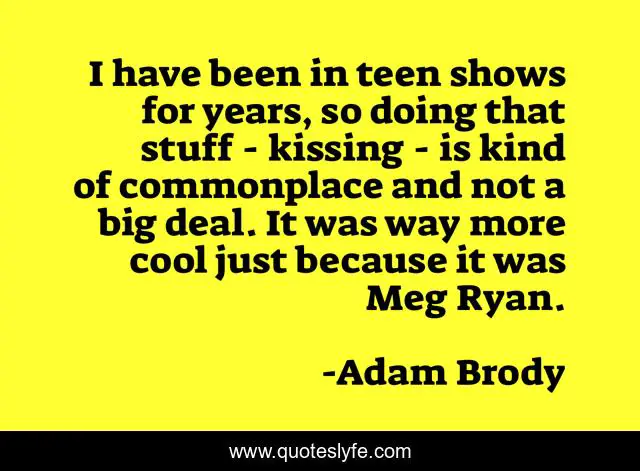 This page presents the quote "I have been in teen shows for years, so doing that stuff - kissing - is kind of commonplace and not a big deal. It was way more cool just because it was Meg Ryan.". Author of this quote is Adam Brody. This quote is about kind, cool,.