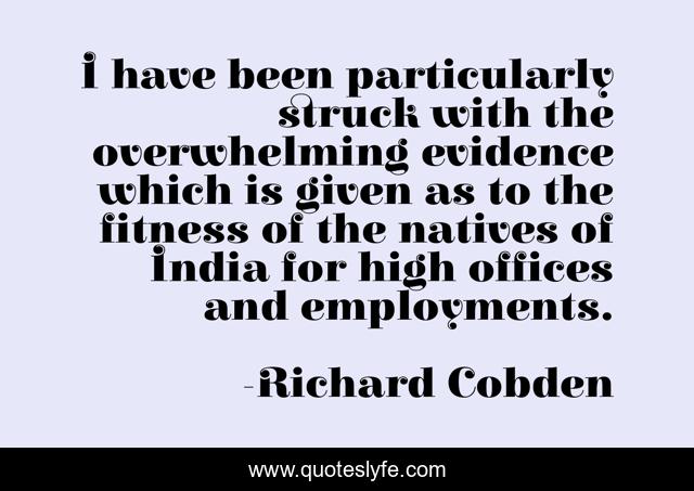 This page presents the quote "I have been particularly struck with the overwhelming evidence which is given as to the fitness of the natives of India for high offices and employments.". Author of this quote is Richard Cobden. This quote is about high, india, evidence,.