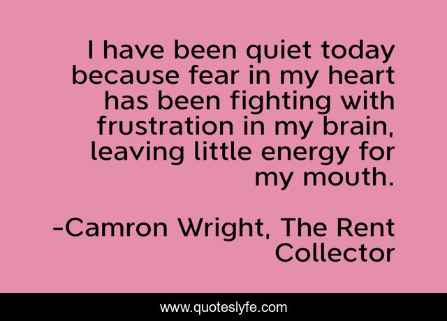 This page presents the quote "I have been quiet today because fear in my heart has been fighting with frustration in my brain, leaving little energy for my mouth.". Author of this quote is Camron Wright, The Rent Collector. This quote is about humor, thought-provoking,.