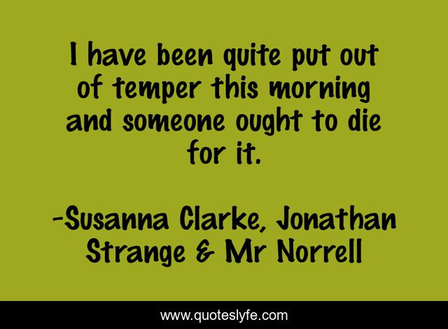 This page presents the quote "I have been quite put out of temper this morning and someone ought to die for it.". Author of this quote is Susanna Clarke, Jonathan Strange & Mr Norrell. This quote is about murder, fairies, temper,.