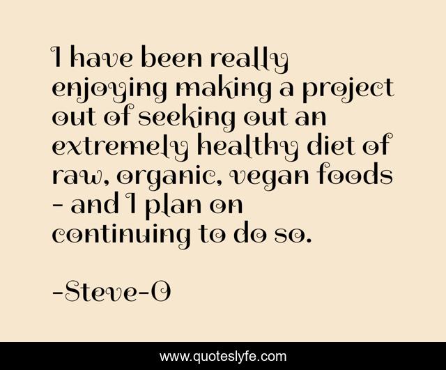 This page presents the quote "I have been really enjoying making a project out of seeking out an extremely healthy diet of raw, organic, vegan foods - and I plan on continuing to do so.". Author of this quote is Steve-O. This quote is about healthy, project, plan,.