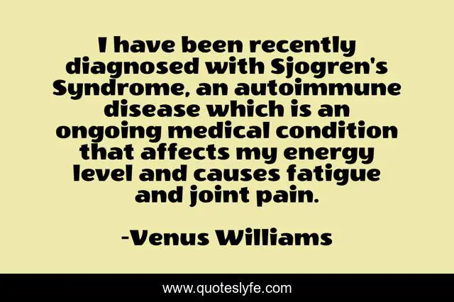 "Venus Williams Quotes." Quoteslyfe.com, 2025. Sat. 06 Dec. 2025. <https://www.quoteslyfe.com/quote/I-have-been-recently-diagnosed-with-Sjogren-309592>.
