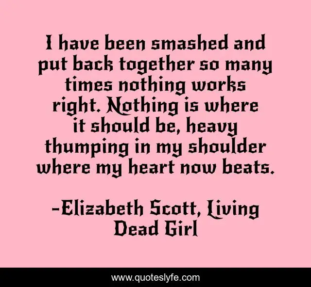 This page presents the quote "I have been smashed and put back together so many times nothing works right. Nothing is where it should be, heavy thumping in my shoulder where my heart now beats.". Author of this quote is Elizabeth Scott, Living Dead Girl. .