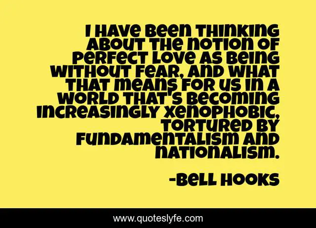 This page presents the quote "I have been thinking about the notion of perfect love as being without fear, and what that means for us in a world that's becoming increasingly xenophobic, tortured by fundamentalism and nationalism.". Author of this quote is bell hooks. This quote is about thinking, world, love, affection,.