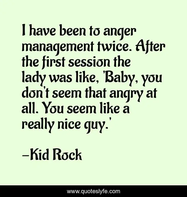 This page presents the quote "I have been to anger management twice. After the first session the lady was like, 'Baby, you don't seem that angry at all. You seem like a really nice guy.'". Author of this quote is Kid Rock. This quote is about baby, management, nice,.