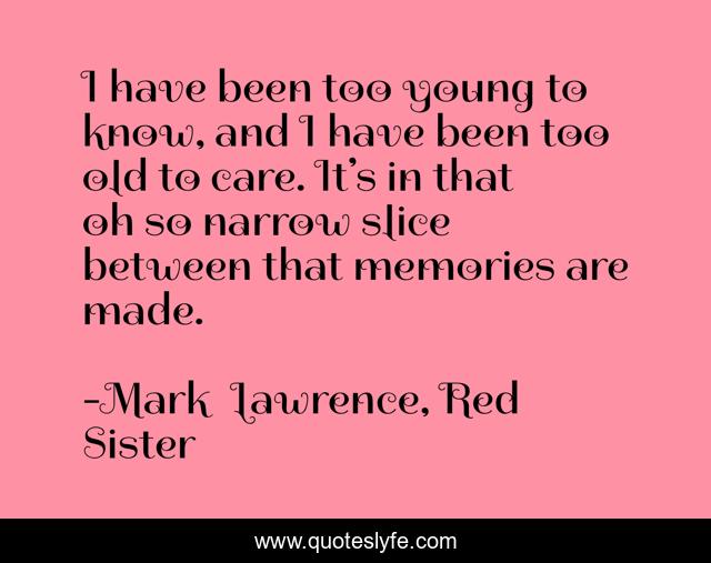 This page presents the quote "I have been too young to know, and I have been too old to care. It’s in that oh so narrow slice between that memories are made.". Author of this quote is Mark Lawrence, Red Sister. This quote is about memories, old, young,.