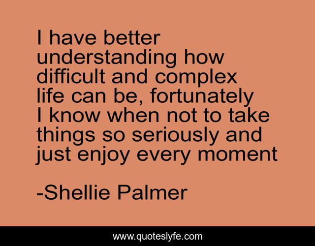 This page presents the quote "I have better understanding how difficult and complex life can be, fortunately I know when not to take things so seriously and just enjoy every moment". Author of this quote is Shellie Palmer. This quote is about live-life-to-the-fullest, life, live-in-the-moment, joyful-living, joy,.