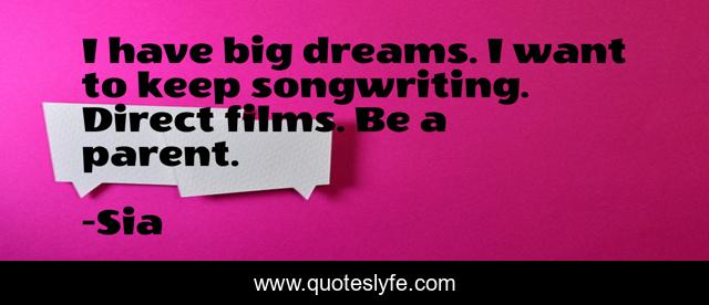 This page presents the quote "I have big dreams. I want to keep songwriting. Direct films. Be a parent.". Author of this quote is Sia. This quote is about songwriting, parent,.