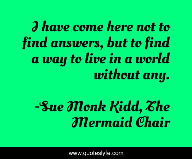 This page presents the quote "I have come here not to find answers, but to find a way to live in a world without any.". Author of this quote is Sue Monk Kidd, The Mermaid Chair. This quote is about life-answers, life, meaning-of-life,.