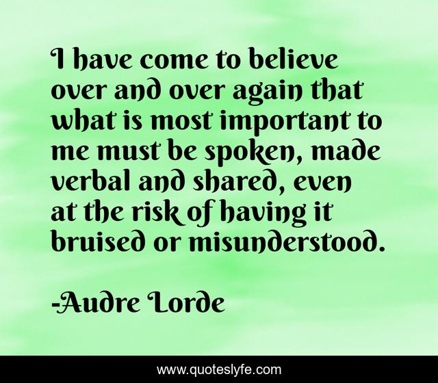 This page presents the quote "I have come to believe over and over again that what is most important to me must be spoken, made verbal and shared, even at the risk of having it bruised or misunderstood.". Author of this quote is Audre Lorde. This quote is about spoken, empowering, silence, speaking-out,.
