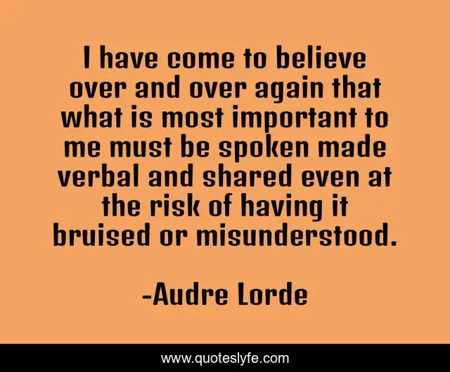 This page presents the quote "I have come to believe over and over again that what is most important to me must be spoken made verbal and shared even at the risk of having it bruised or misunderstood.". Author of this quote is Audre Lorde. This quote is about self, acceptance,.