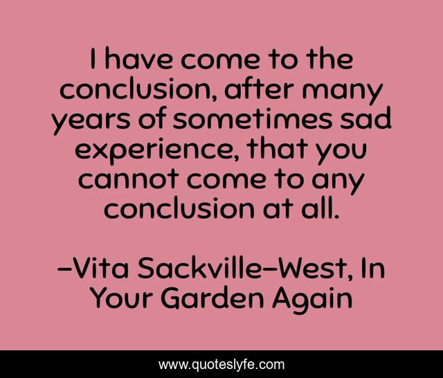 This page presents the quote "I have come to the conclusion, after many years of sometimes sad experience, that you cannot come to any conclusion at all.". Author of this quote is Vita Sackville-West, In Your Garden Again. This quote is about life, experience, conclusion,.