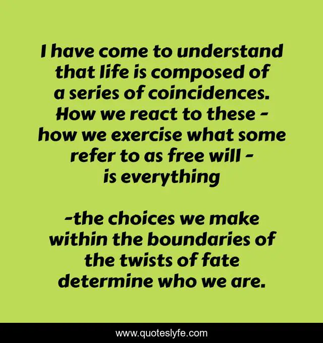 This page presents the quote "I have come to understand that life is composed of a series of coincidences. How we react to these - how we exercise what some refer to as free will - is everything". Author of this quote is the choices we make within the boundaries of the twists of fate determine who we are.. .