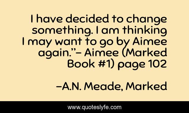 This page presents the quote "I have decided to change something. I am thinking I may want to go by Aimee again.”- Aimee (Marked Book #1) page 102". Author of this quote is A.N. Meade, Marked. This quote is about angels-and-demons, witchcraft, werewolf, vampire, vampire-romance-series, paranormal-romance,.