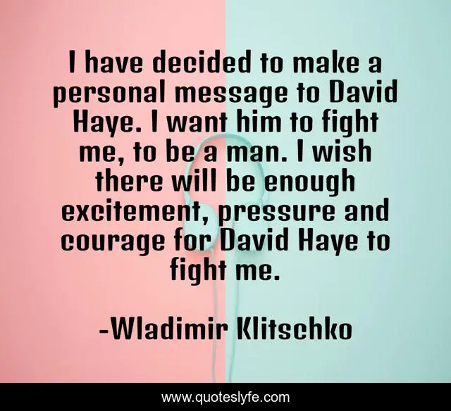 This page presents the quote "I have decided to make a personal message to David Haye. I want him to fight me, to be a man. I wish there will be enough excitement, pressure and courage for David Haye to fight me.". Author of this quote is Wladimir Klitschko. This quote is about me, man, fight,.