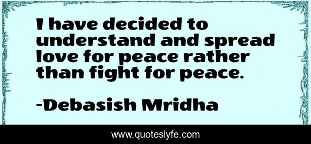 This page presents the quote "I have decided to understand and spread love for peace rather than fight for peace.". Author of this quote is Debasish Mridha. This quote is about peace, love, fight-for-peace, philosophy, debasish-mridha, quotes, debasish-mridha-md, inspirational, enthusiasm,.