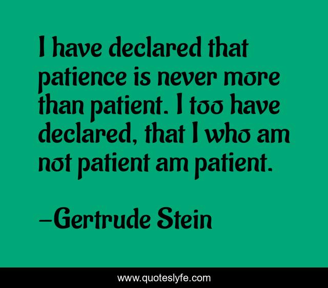 This page presents the quote "I have declared that patience is never more than patient. I too have declared, that I who am not patient am patient.". Author of this quote is Gertrude Stein. .