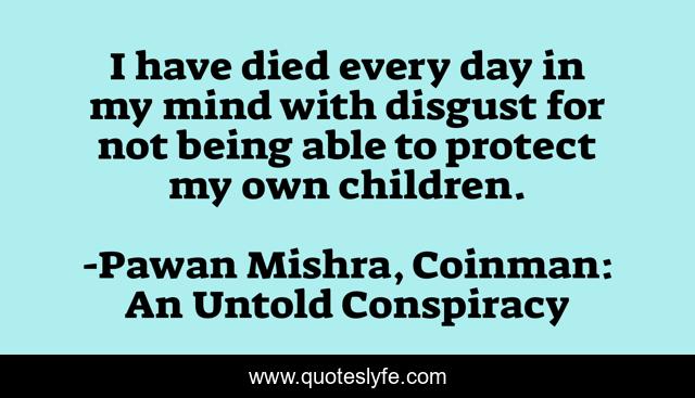 This page presents the quote "I have died every day in my mind with disgust for not being able to protect my own children.". Author of this quote is Pawan Mishra, Coinman: An Untold Conspiracy. This quote is about helplessness, dying, protection, disgust, helpless, children,.
