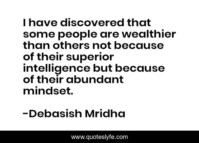 This page presents the quote "I have discovered that some people are wealthier than others not because of their superior intelligence but because of their abundant mindset.". Author of this quote is Debasish Mridha. This quote is about what-makes-a-person-wealthy, abundant-mindset, philosophy, debasish-mridha, what-is-wealth, quotes, debasish-mridha-md, inspirational, enthusiasm,.