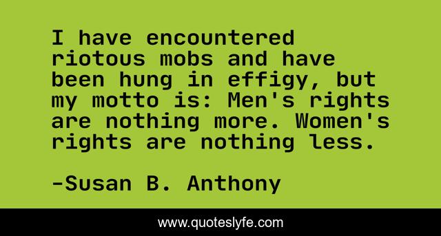 This page presents the quote "I have encountered riotous mobs and have been hung in effigy, but my motto is: Men's rights are nothing more. Women's rights are nothing less.". Author of this quote is Susan B. Anthony. This quote is about motto, men, rights,.