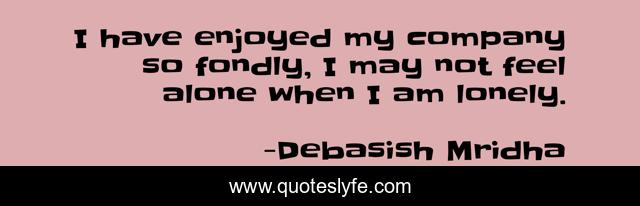 This page presents the quote "I have enjoyed my company so fondly, I may not feel alone when I am lonely.". Author of this quote is Debasish Mridha. This quote is about i-may-not-feel-alone, enjoy-my-company, philosophy, debasish-mridha, quotes, debasish-mridha-md, inspirational, alone-and-not-lonely, enthusiasm,.