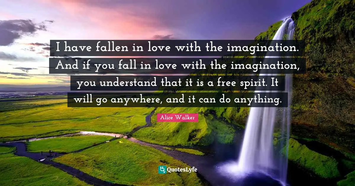 This page presents the quote "I have fallen in love with the imagination. And if you fall in love with the imagination, you understand that it is a free spirit. It will go anywhere, and it can do anything.". Author of this quote is Alice Walker. This quote is about love, free, affection, fall,.
