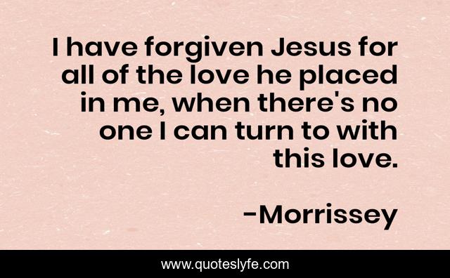This page presents the quote "I have forgiven Jesus for all of the love he placed in me, when there's no one I can turn to with this love.". Author of this quote is Morrissey. This quote is about humor, music, lyrics,.