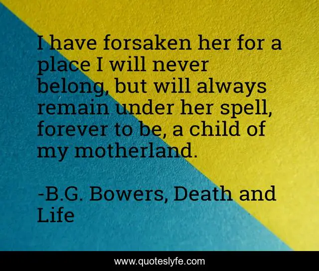 This page presents the quote "I have forsaken her for a place I will never belong, but will always remain under her spell, forever to be, a child of my motherland.". Author of this quote is B.G. Bowers, Death and Life. This quote is about motherland, outsider, africa, identity, exile, extradition,.