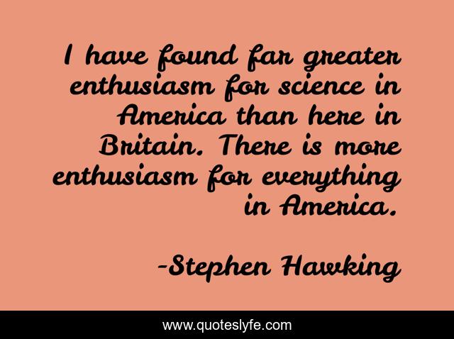 This page presents the quote "I have found far greater enthusiasm for science in America than here in Britain. There is more enthusiasm for everything in America.". Author of this quote is Stephen Hawking. This quote is about enthusiasm, america, here,.