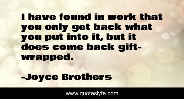 This page presents the quote "I have found in work that you only get back what you put into it, but it does come back gift-wrapped.". Author of this quote is Joyce Brothers. This quote is about found, back,.