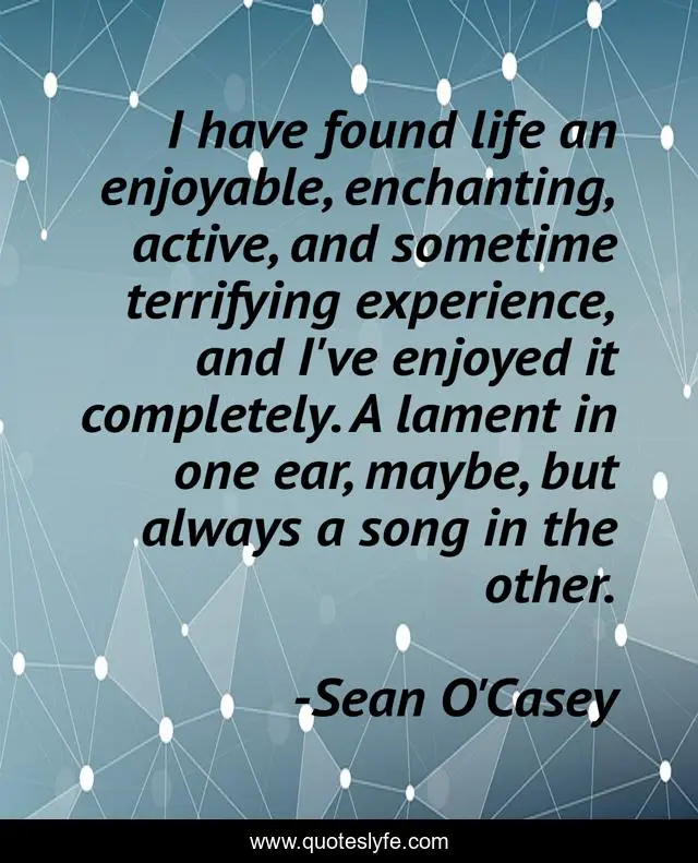 This page presents the quote "I have found life an enjoyable, enchanting, active, and sometime terrifying experience, and I've enjoyed it completely. A lament in one ear, maybe, but always a song in the other.". Author of this quote is Sean O'Casey. This quote is about always, life, song,.