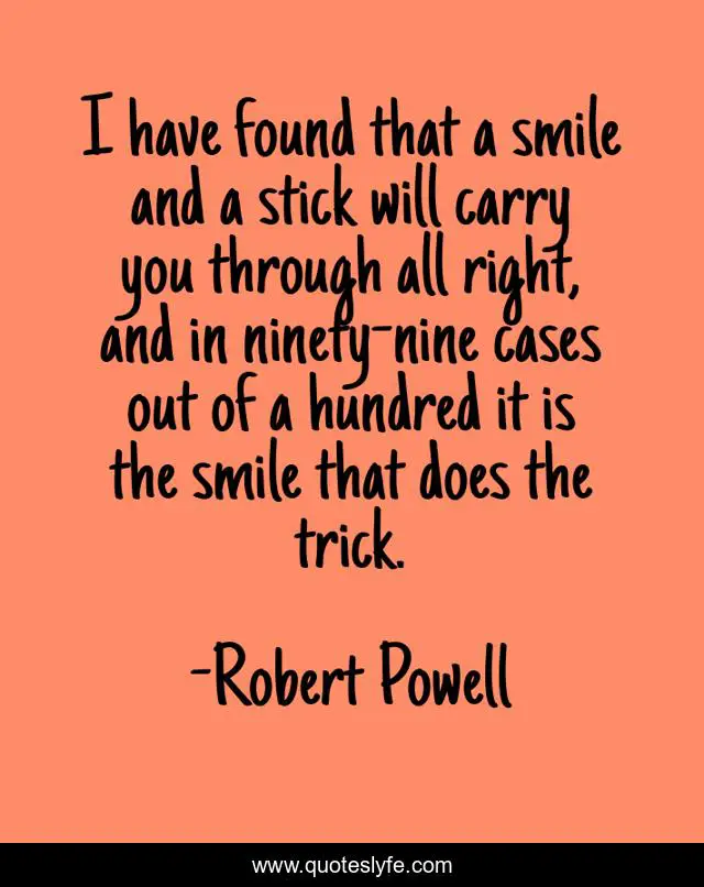 This page presents the quote "I have found that a smile and a stick will carry you through all right, and in ninety-nine cases out of a hundred it is the smile that does the trick.". Author of this quote is Robert Powell. This quote is about right, through,.