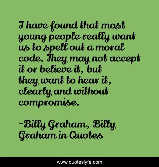 This page presents the quote "I have found that most young people really want us to spell out a moral code. They may not accept it or believe it, but they want to hear it, clearly and without compromise.". Author of this quote is Billy Graham, Billy Graham in Quotes. This quote is about young-people, billy-graham,.