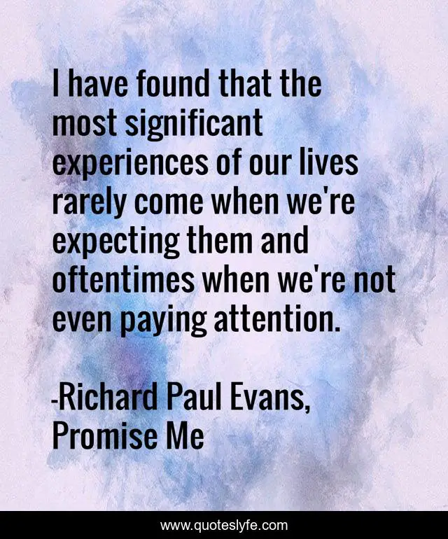 This page presents the quote "I have found that the most significant experiences of our lives rarely come when we're expecting them and oftentimes when we're not even paying attention.". Author of this quote is Richard Paul Evans, Promise Me. This quote is about life, life-experience, expectations,.