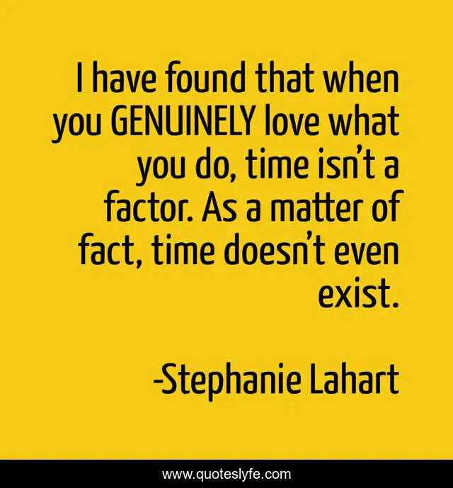 This page presents the quote "I have found that when you GENUINELY love what you do, time isn’t a factor. As a matter of fact, time doesn’t even exist.". Author of this quote is Stephanie Lahart. This quote is about inspiring, quote, stephanie-lahart, life, quotes, inspirational, time, enthusiasm,.