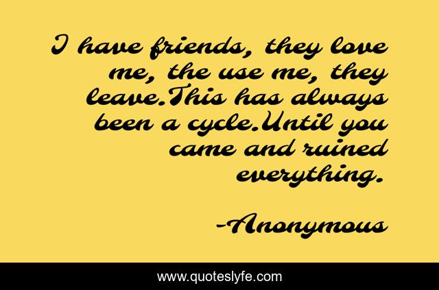This page presents the quote "I have friends, they love me, the use me, they leave.This has always been a cycle.Until you came and ruined everything.". Author of this quote is Anonymous. .