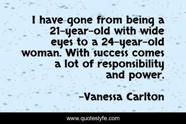 This page presents the quote "I have gone from being a 21-year-old with wide eyes to a 24-year-old woman. With success comes a lot of responsibility and power.". Author of this quote is Vanessa Carlton. This quote is about eyes, responsibility, power,.
