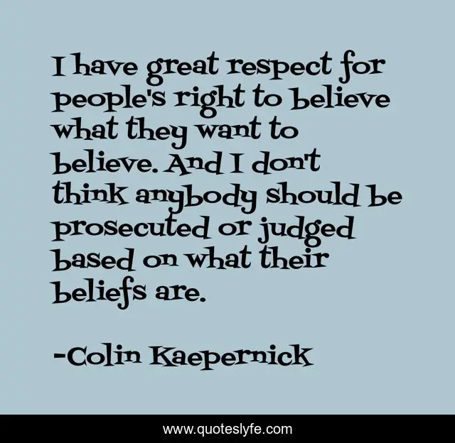 This page presents the quote "I have great respect for people's right to believe what they want to believe. And I don't think anybody should be prosecuted or judged based on what their beliefs are.". Author of this quote is Colin Kaepernick. This quote is about great, believe, people,.