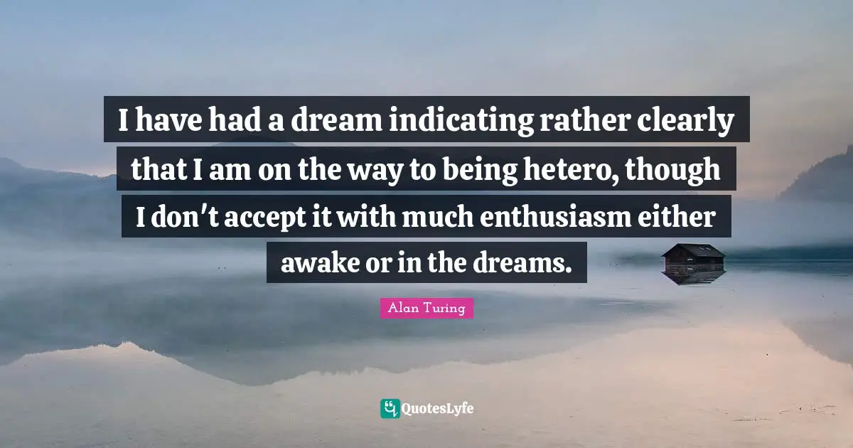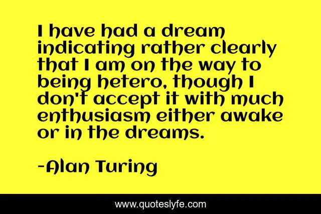 This page presents the quote "I have had a dream indicating rather clearly that I am on the way to being hetero, though I don't accept it with much enthusiasm either awake or in the dreams.". Author of this quote is Alan Turing. This quote is about enthusiasm, dream,.