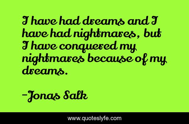 This page presents the quote "I have had dreams and I have had nightmares, but I have conquered my nightmares because of my dreams.". Author of this quote is Jonas Salk. This quote is about nightmares, because,.