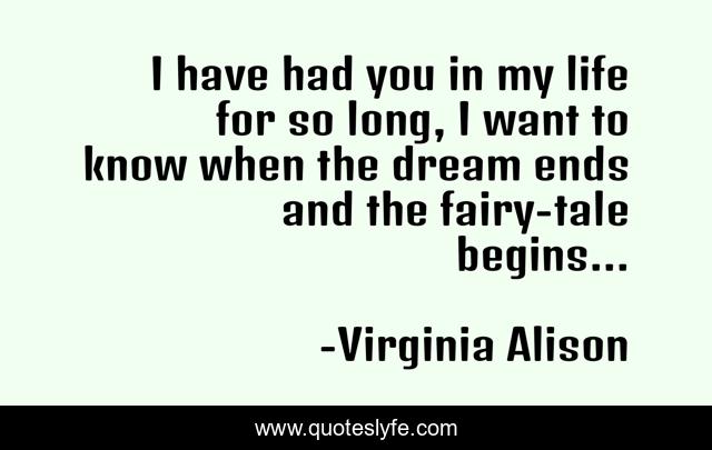 This page presents the quote "I have had you in my life for so long, I want to know when the dream ends and the fairy-tale begins...". Author of this quote is Virginia Alison. This quote is about life, dream, fairy-tale,.