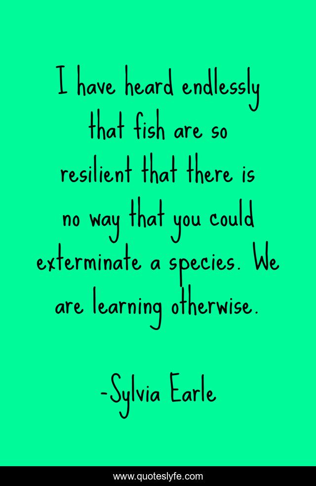 This page presents the quote "I have heard endlessly that fish are so resilient that there is no way that you could exterminate a species. We are learning otherwise.". Author of this quote is Sylvia Earle. This quote is about fish, way,.