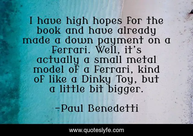 This page presents the quote "I have high hopes for the book and have already made a down payment on a Ferrari. Well, it’s actually a small metal model of a Ferrari, kind of like a Dinky Toy, but a little bit bigger.". Author of this quote is Paul Benedetti. This quote is about author, real-life-struggle, humor, writers, writing,.